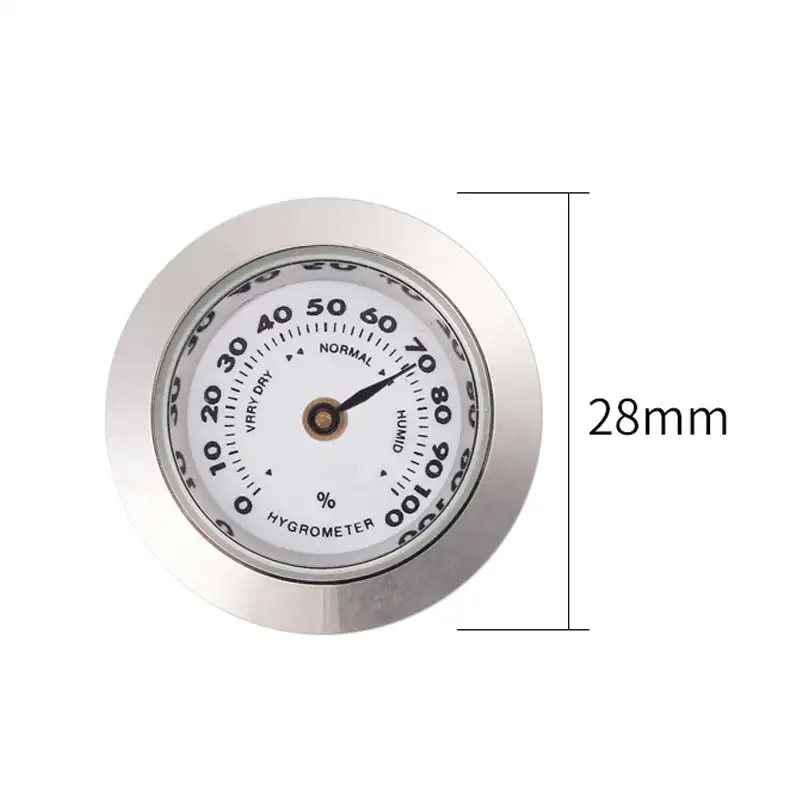 This 28mm mini round metal hygrometer is a compact, high-precision humidity monitoring solution tailored for small enclosed spaces like cigar humidors, herb storage jars, mini greenhouses, and travel cases; featuring an elegant appearance and premium build quality, it delivers accurate humidity readings to preserve the freshness and quality of your valuables.