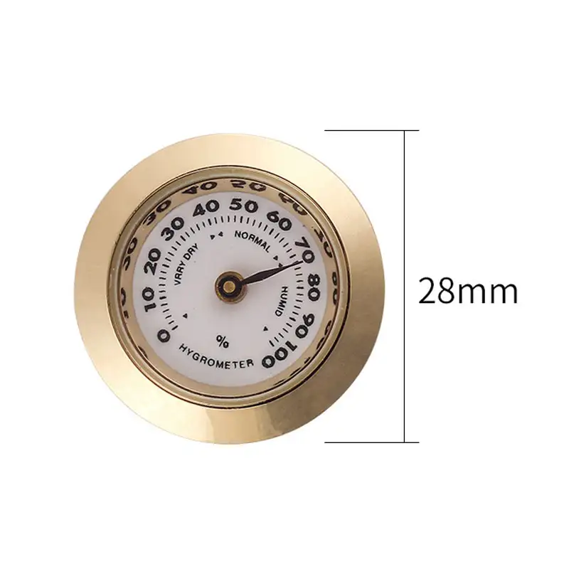 This 28mm mini round metal hygrometer is a compact, high-precision humidity monitoring solution tailored for small enclosed spaces like cigar humidors, herb storage jars, mini greenhouses, and travel cases; featuring an elegant appearance and premium build quality, it delivers accurate humidity readings to preserve the freshness and quality of your valuables.