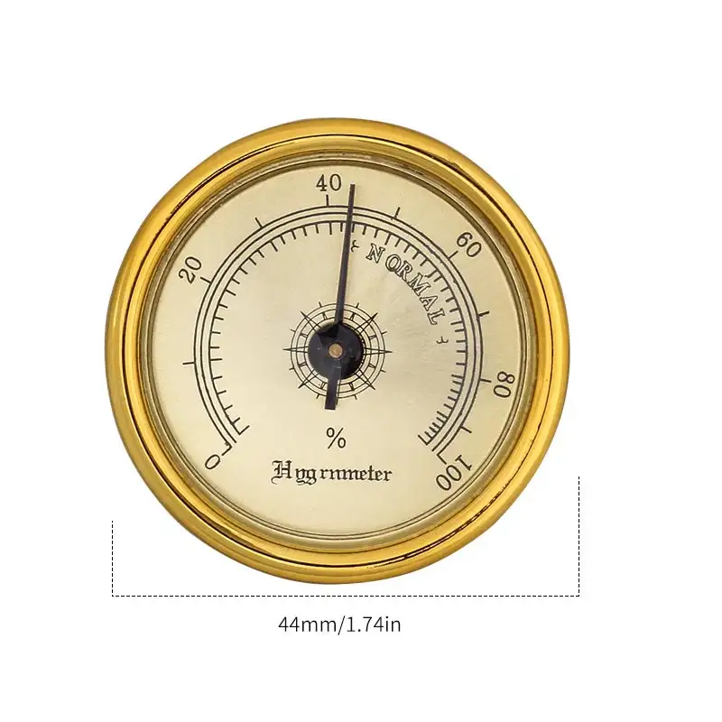 1. Model No.: CP-G201 2. Material: Stainless Steel and Plastic 3. Size: Dia. 44mm 4. Color : Gold/Customized 5. Style: Simple, Modern, Classics 6. Use: Smoking, Cigars 7. Feature:Stable Performance, Easy Reading & Installation 8. MOQ: 300pcs 9. Sample lead time: 3-7 days 10. Place of origin: Guangdong,China